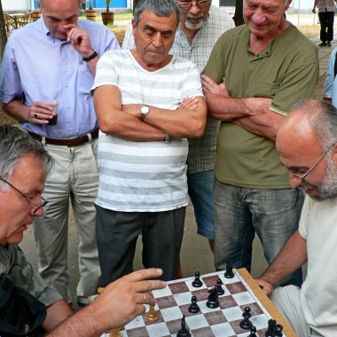 Přehledná a vyvážená fotografie na levé straně dokumentuje nejen zaujetí pro hru, ale i prostředí, kde se akce odehrává. Pomyslným spojením hlav všech tří figur na snímku by vznikly dramatické diagonály, gesta rukou jsou dobře zachycena, plocha snímku je vyváženě vyplněna. Druhá fotografie je velice nepřehledná, což vzniklo příliš brutálním ořezem. Působí nedokončeně, oko diváka stále něco hledá a nesoustředí se na hlavní prvek. To, co by mělo být hlavní, šachisté a šachovnice, je vlastně potlačeno.